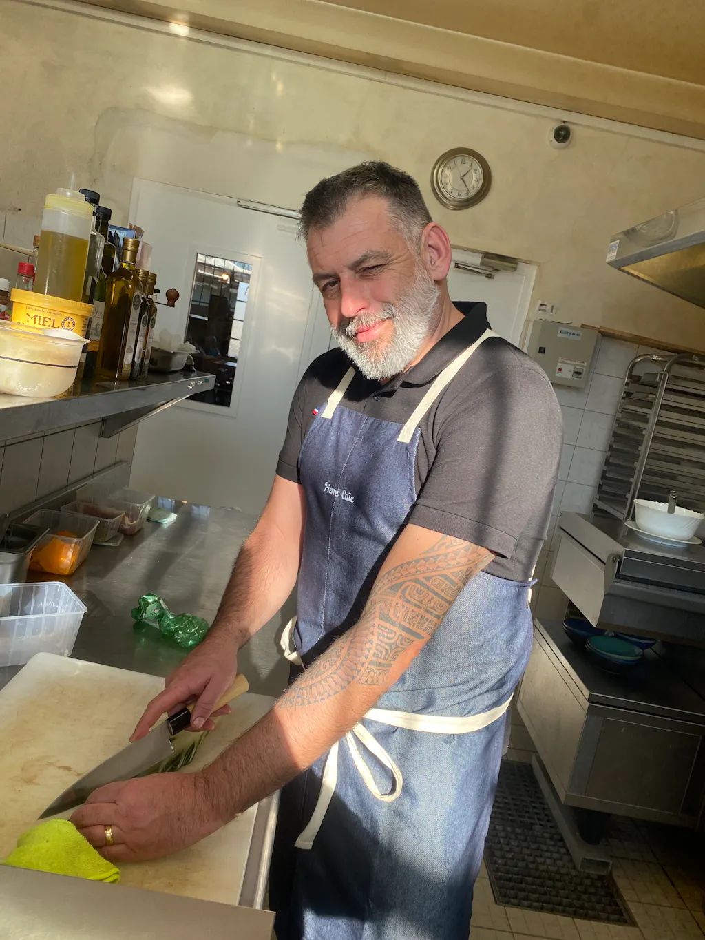 Une poche à droite avec passe torchon contrasté et petit galon tricolore (le détail qui fait mouche !).